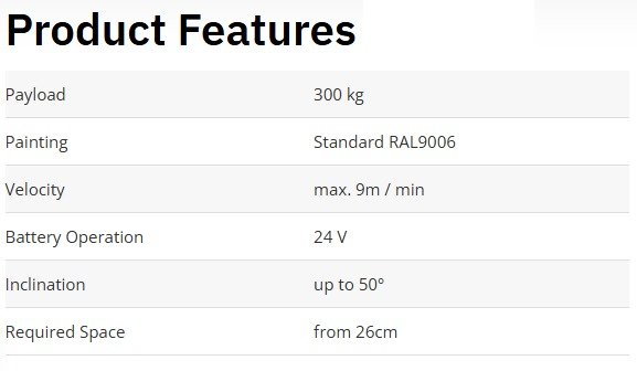 Design finish in silver metallic, automatic control of barriers and floor flaps, stainless steel handrail along the stairs, sensor buttons, soft start and soft stop, emergency call button, emergency stop switch, automatic speed reduction in curves, anti-trap protection on the sides and underside of the platform, battery drive with 4 batteries and charger, grab handle and anti-slip knobs.